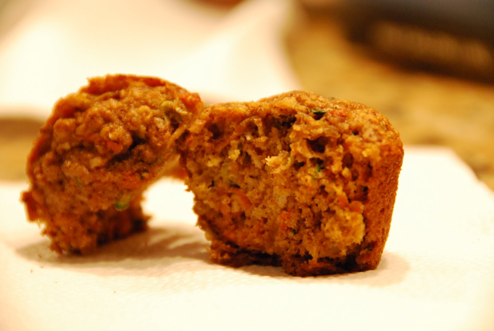 Well, I’m sad to report that my recent Whole Wheat Zucchini Muffins, which I said may be perfect, are not – while I still stand by the deliciousness and healthfulness claims, they have the fatal flaw of being completely rejected by the munchkin. And while hubby thought it was good news that there would be more left for him, a big reason I make muffins is so that I can have healthy snacks on hand for the munchkin. I’m pretty sure that the reason she didn’t like them was the walnuts and cranberries, so I decided to make a similar veggie-packed muffin without the mix-ins. I could have remade the same recipe, but I have been wanting to make my Carrot Cupcakes again as a muffin (i.e., no glaze), so I thought maybe I could use that recipe and replace half of the carrots with zucchini. And while I was at it, I decided to play around with an agave-sugar mixture instead of all agave in order to test a hypothesis that agave makes things brown a lot and also leads to stickiness.