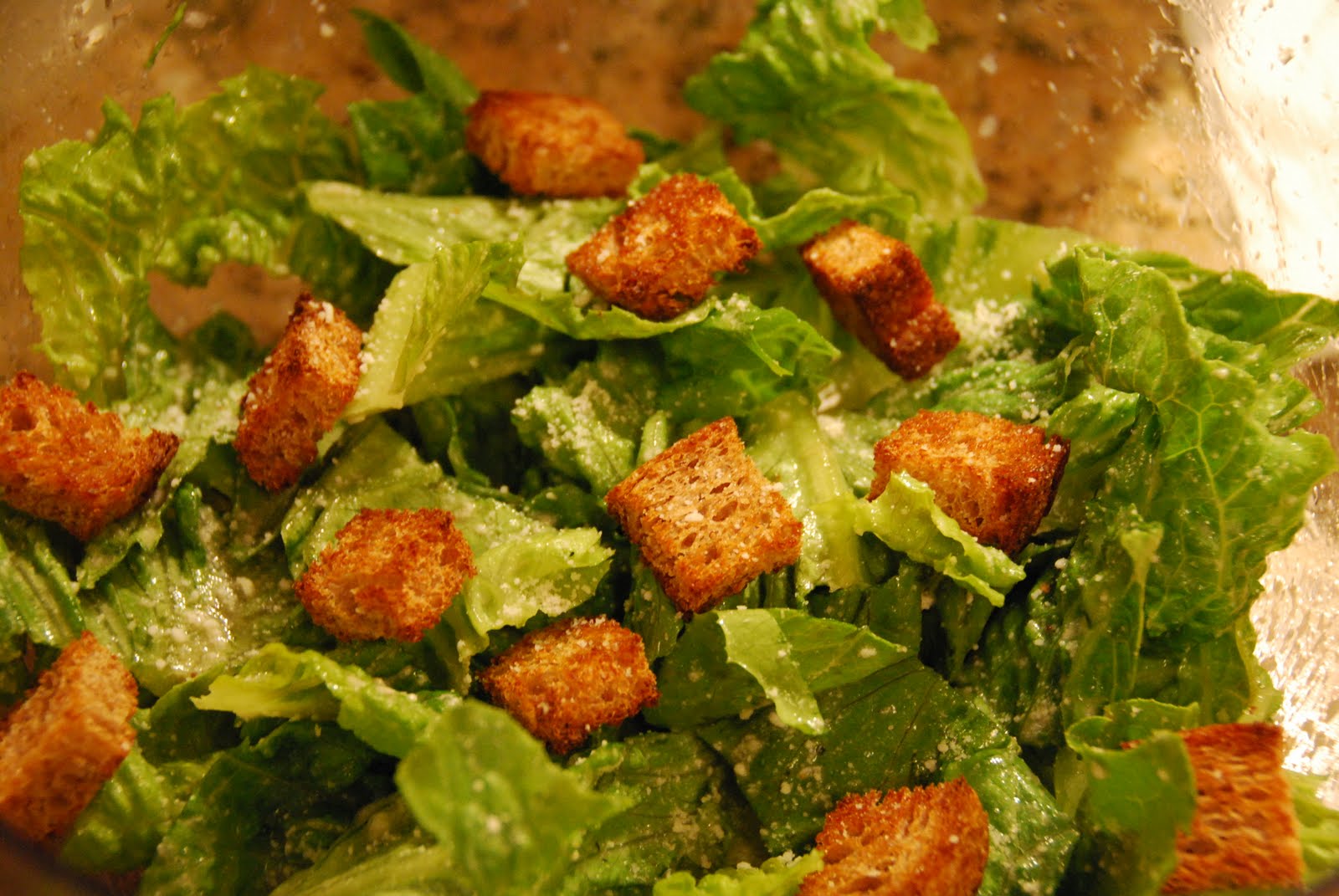 Well, at home it’s possible to make a caesar salad that is yummy AND healthy! Ellie Krieger has a recipe for dressing that is delicious – so flavorful and yet fairly light. I’ve also found that you can make homemade croutons out of whole grain bread that add that nice crunch to a salad without all the grease. You could also add some grilled chicken or shrimp to make this a complete meal, but even as a simple side this was a big hit in my house – let me know what you think!