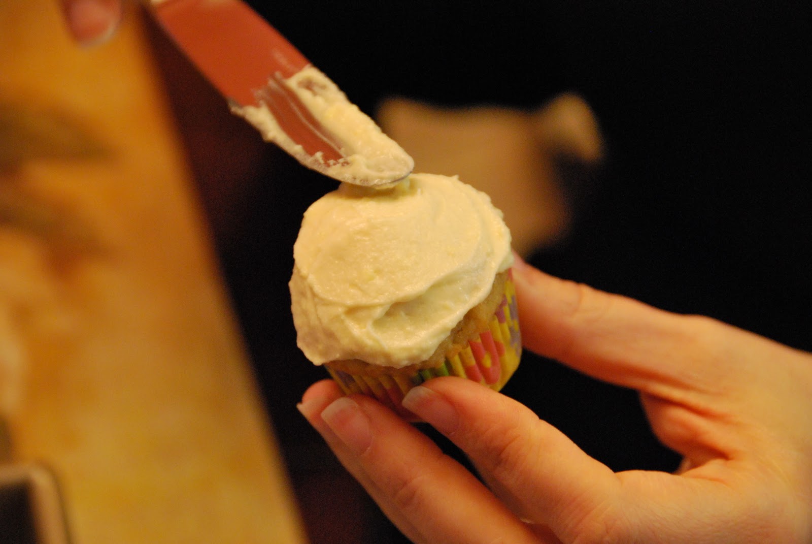 The first trick is to use cream cheese! Cream cheese is not exactly a low fat food, but tablespoon for tablespoon, even the full fat variety has half the fat and calories as butter, which is the traditional base for frosting. Sub a low-fat variety (like Neufchatel) and you’re now at less than half the calories and one quarter the fat of butter. As you’ll see in the cupcake recipes, I actually used a combination of cream cheese and butter so that the frosting would taste a little more traditional, but would have some of the benefit of the substitution. The second trick is to add sugar slowly. I found I was able to reduce the sugar in both recipes I found and still have a frosting that was plenty sweet by starting with about 1/2 to 2/3 the recommended amount and increasing only as needed.