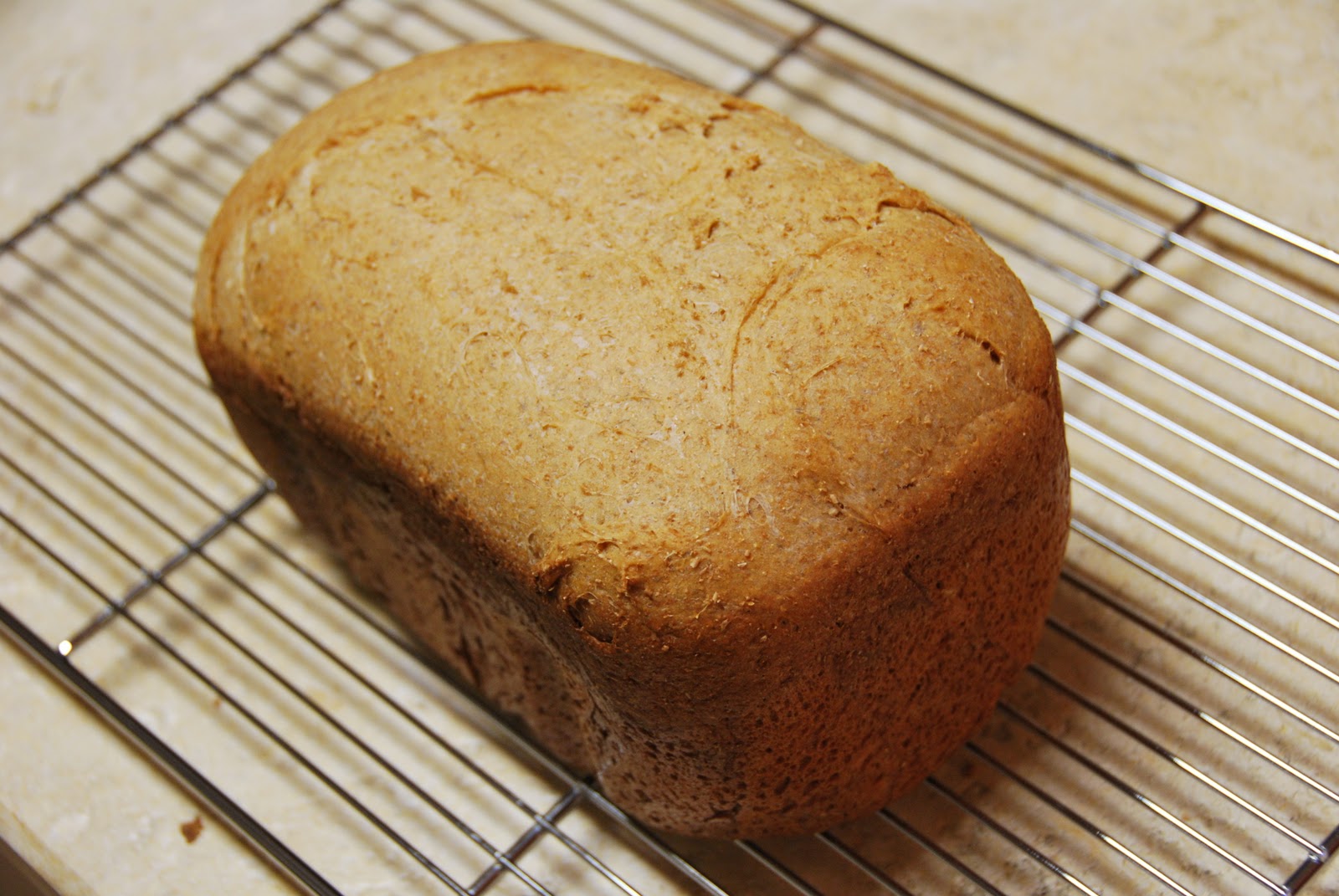 As I talked about in great detail in my post about why I love my bread machine, over the last few months I have learned that it is entirely possible to feed my family homemade bread without tons of effort – all I needed was a little help from a cumbersome but very useful appliance! I am committed to having our daily bread be 100% whole grain, and so far I’ve found 2 recipes that are really nice. This one is a pretty basic whole wheat – definitely a more dense choice, but really nicely textured and is even good toasted after several days sitting around. This has full approval from the munchkin, and all of the grown-ups in my life seem to love it! Although recently I have actually been lightening the loaf a bit by replacing 1 cup of the whole wheat flour with white whole wheat flour, and have been very happy with the results.